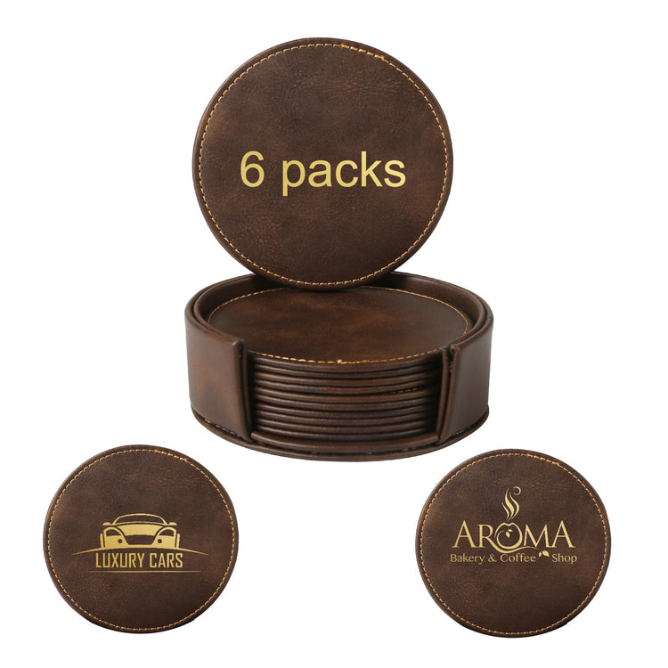 Personalized Brown Leather Coasters and Holder 4" for Laser Engraving - 6pcs